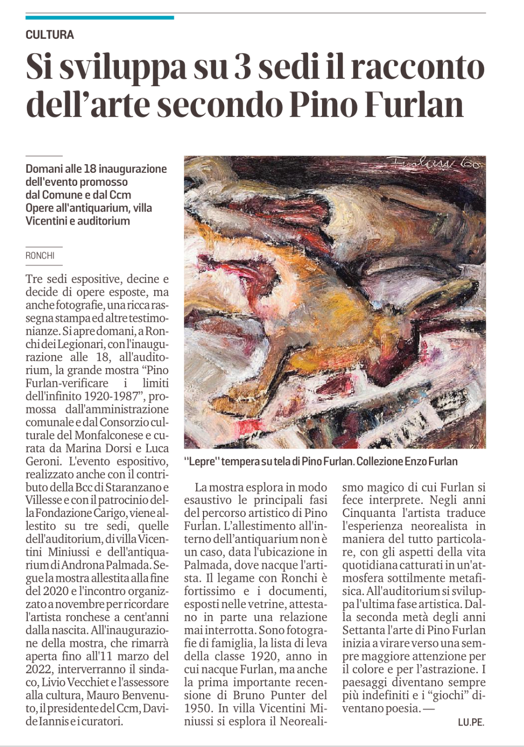 Il Comune di Ronchi dei Legionari e il Consorzio Culturale del Monfalconese - Ecomuseo Territori presentano venerdì 10 dicembre, alle 18, nell'Auditorium comunale di via Cau de Mezo, a Ronchi dei Legionari, la mostra "Pino Furlan - verificare i limiti dell'infinito 1920-1987", a cura di Marina Dorsi e Luca Geroni. L'importante evento espositivo, realizzato anche con il contributo della Banca di Credito Cooperativo di Staranzano e Villesse e con il patrocinio della Fondazione Cassa di Risparmio di Gorizia, viene allestito su tre sedi, quelle dell'Auditorium, di Villa Vicentini Miniussi, sede del CCM, e dell'Antiquarium di Androna Palmada, segue la mostra allestita alla fine del 2020 e all'incontro organizzato a novembre per ricordare l'artista ronchese a cent'anni dalla nascita. All'inaugurazione della mostra, che rimarrà aperta fino all'11 marzo del 2022, interverranno il Sindaco Livio Vecchiet e l'Assessore alla Cultura di Ronchi dei Legionari Mauro Benvenuto, il Presidente del Consorzio Culturale Davide Iannis e i curatori. La mostra si articola in tre sezioni, esplorando in modo esaustivo le principali fasi del percorso artistico di Pino Furlan
