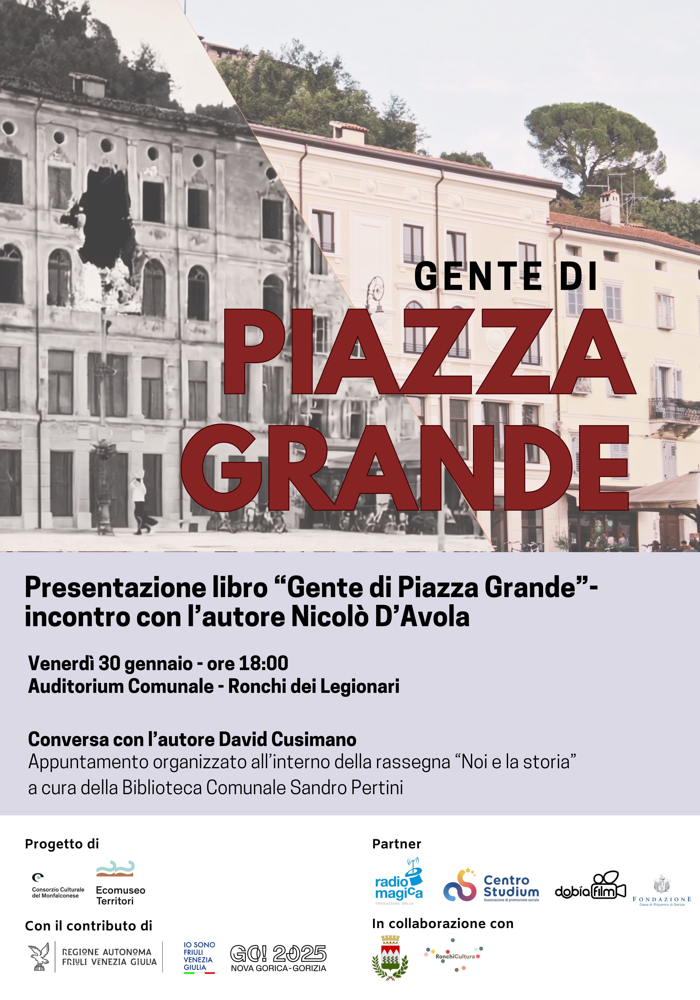 Nicolò Sandro D'Avola e David Cusimano presentano il volume "Gente di Piazza Grande", uno deli degli appuntamenti in programma nell'ambito del progetto "Gente di Piazza Grande", in questo caso ospitati nell'ambito della manifestazione organizzata dal Comune di Ronchi "Noi e la Storia".